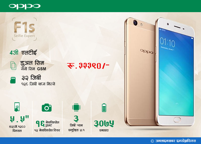 विश्वमा सेल्फी रिभोलुसनका लागि ओप्पो ब्राण्ड सबैभन्दा अब्बल मानिन्छ । यसैमा आधारित भएर एफ-१ एस स्लिक मेटल बडी भएको स्मार्टफोन हो ।